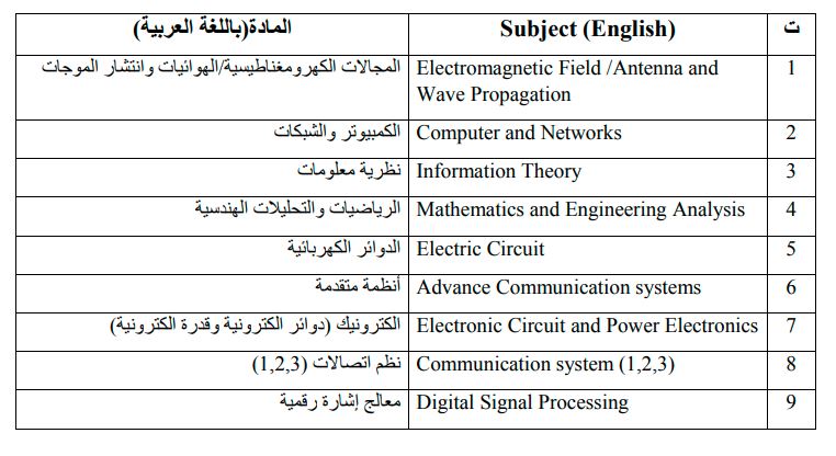 تفاصيل المواد الدراسية قسم هندسة تقنيات الإتصالات