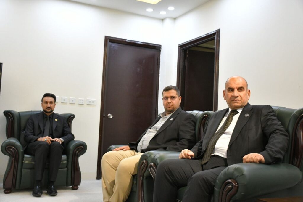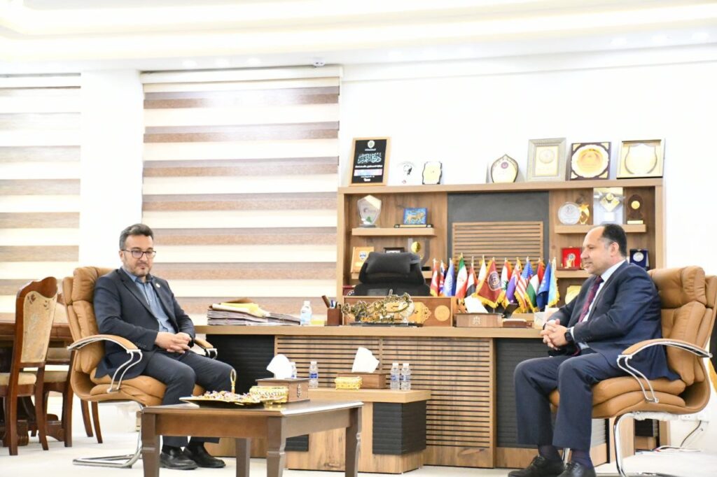 بحث السيد رئيس جامعة الفرات الأوسط التقنية الاستاذ الدكتور حسن لطيف الزبيدي مع السيد رئيس جامعة آزاد الإيرانية- فرع النجف الأشرف الدكتور فريد نعيمي والوفد المرافق له ، سبل التعاون العلمي بين الجامعتين في عدد من المجالات الأكاديمية والعلمية ذات الإهتمام المشترك ومنها تبادل الخبرات وأمكانية تنظيم أنشطة علمية مشتركة.