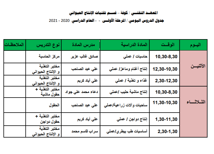 | الاربعاء | 10:30 AM | انتاج ماشية حليب | نظري | حسين تخيل حسين / استاذ | 3i7olfz | https://meet.google.com/cty-cgdd-tni |
