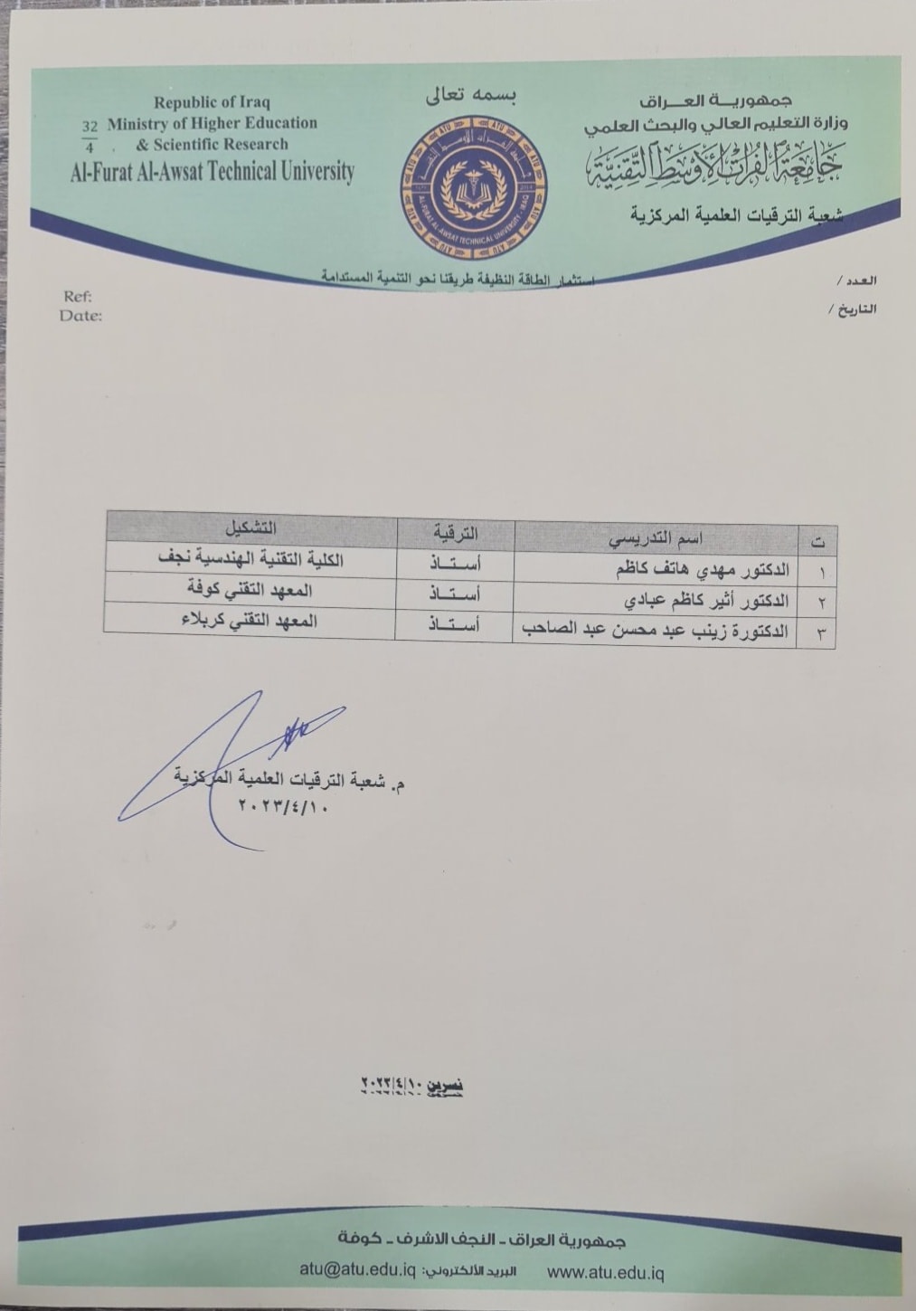 رئيس جامعة الفرات الأوسط التقنية يصادق على الترقيا... صادق السيد رئيس جامعة الفرات الأوسط التقنية الأستاذ الدكتور حسن لطيف كاظم الزبيدي على الترقيات العلمية لمختلف المراتب العلمية لبعض التدريسيين في معظم تشكيلاتها...