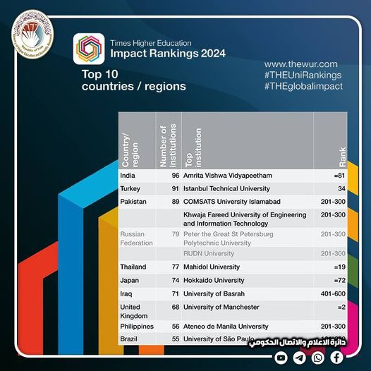 في المرتبة الأولى عربيا والسابعة عالميا .. العراق... تأكيدا على مؤشر الخدمات التعليمية في الجامعات العراقية وبرامجها الأكاديمية المتنوعة وارتباطها بمسار التنمية المستدامة وأهدافها ومواجهة التحديات ومواكبة الم...
