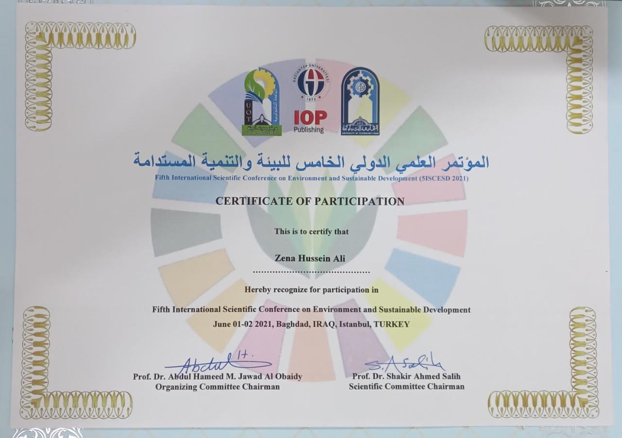 باحثة من جامعة الفرات الاوسط التقنية تشارك في المؤ... شاركت الباحثة زينا حسين علي من الكلية التقنية المسيب بجامعة الفرات الاوسط التقنية في المؤتمر الدولي العلمي الخامس للبيئة والتنمية المستدامة (2021 5ISCESD-)...