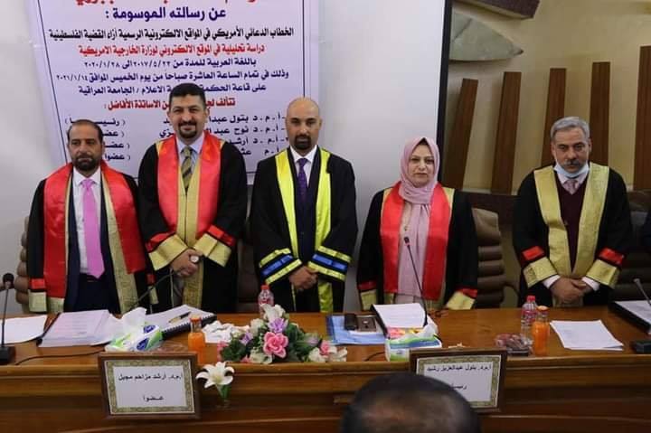 رسالة ماجستير لمنتسب من جامعة الفرات الاوسط التقني... بحثت رسالة ماجستير للمنتسب وسام احمد عبد الله من الكلية التقنية المسيب /جامعة الفرات الاوسط التقنية عن الخطاب الدعائي الأمريكي إزاء القضية الفلسطينية...